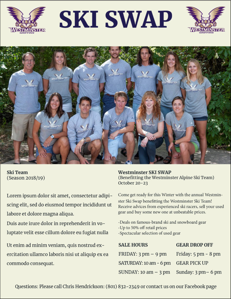I created this flyer to advertise the Westminster Ski Team’s ski swap, an event creating over $50,000 in revenue last year.