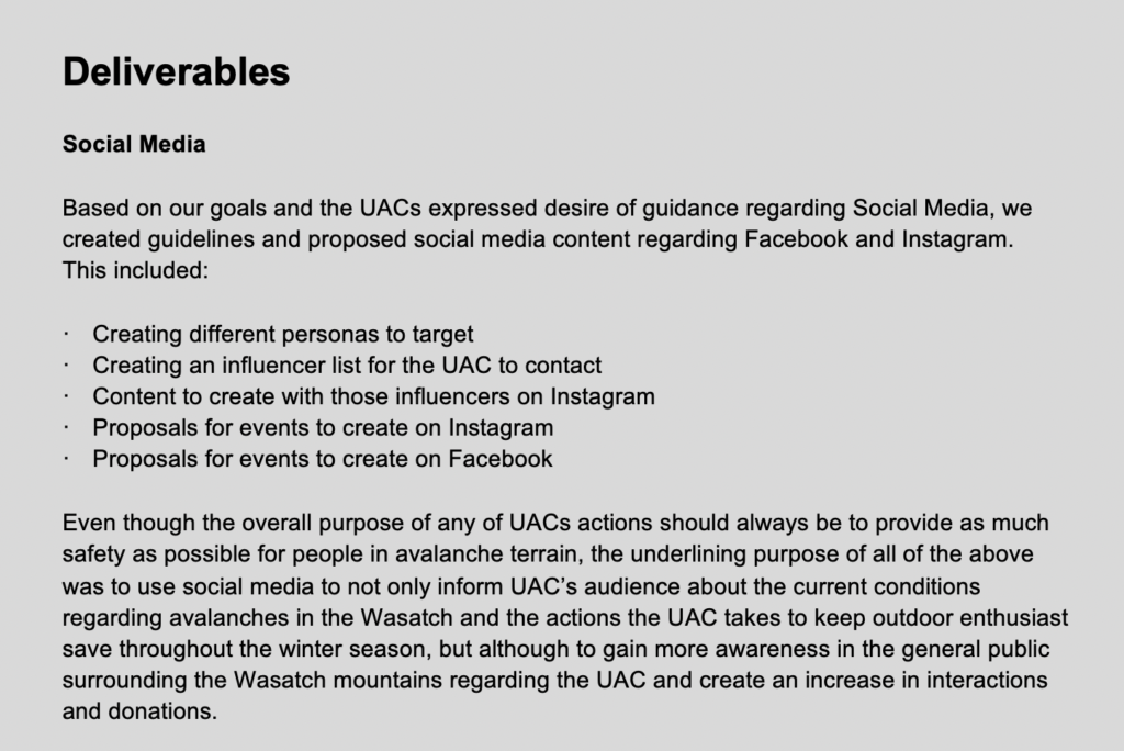 My team’s goal for this service learning project was to assess and improve the Utah Avalanche Center’s strategic PR plan, specifically related to social media.